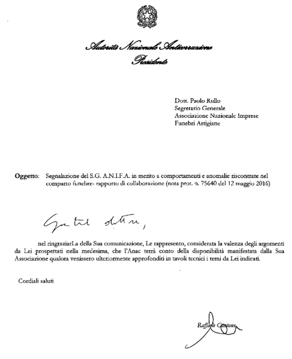 Ringraziamo pubblicamente il dott. Raffaele Cantone per non aver cestinato la nostra comunicazione, per aver valutato valenti le nostre argomentazioni e sopratttutto per la cortesia di avercelo comunicato.